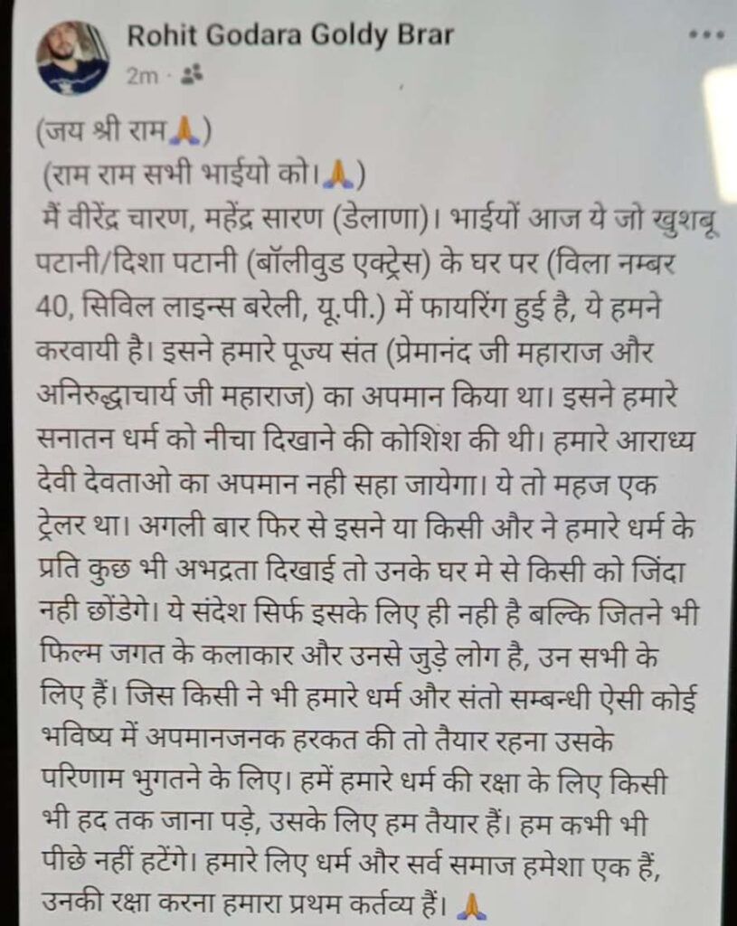 ਇਸ ਦੇ ਨਾਲ ਹੀ, ਫੇਸਬੁੱਕ ‘ਤੇ ਇੱਕ ਸੋਸ਼ਲ ਮੀਡੀਆ ਪੋਸਟ ਵੀ ਵਾਇਰਲ ਹੋ ਰਹੀ ਹੈ ਜਿਸ ਵਿੱਚ ਗੈਂਗਸਟਰ ਰੋਹਿਤ ਗੋਦਾਰਾ ਨੇ ਬਾਲੀਵੁੱਡ ਅਦਾਕਾਰਾ ਦਿਸ਼ਾ ਪਟਨੀ ਦੇ ਘਰ ‘ਤੇ ਗੋਲੀਬਾਰੀ ਦੀ ਜ਼ਿੰਮੇਵਾਰੀ ਲਈ ਹੈ। ਹਾਲਾਂਕਿ, ਇਹ ਪੋਸਟ ਪ੍ਰਮਾਣਿਤ ਨਹੀਂ ਹੈ, ਇਸ ਲਈ ਬਰੇਲੀ ਪੁਲਿਸ ਇਸਦੀ ਜਾਂਚ ਵੀ ਕਰ ਰਹੀ ਹੈ।