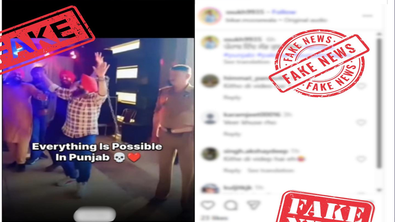 ਇੱਕ ਵਿਆਹ ਸਮਾਰੋਹ ਵਿੱਚ ਪੁਲਿਸ ਵਾਲਿਆਂ ਦੁਆਰਾ ਹੱਥਕੜੀਆਂ ਲਗਾ ਕੇ ਭੰਗੜਾ ਪਾਉਂਦੇ ਹੋਏ ਇੱਕ ਸਰਦਾਰ ਮੁੰਡੇ ਦਾ ਵੀਡੀਓ ਸੋਸ਼ਲ ਮੀਡੀਆ ‘ਤੇ ਵਾਇਰਲ ਹੋ ਰਿਹਾ ਹੈ। ਇਸਨੂੰ ਪੰਜਾਬ ਪੁਲਿਸ ਦੇ ਨਕਲੀ ਲਿੰਕ ਵਜੋਂ ਸਾਂਝਾ ਕੀਤਾ ਜਾ ਰਿਹਾ ਹੈ।