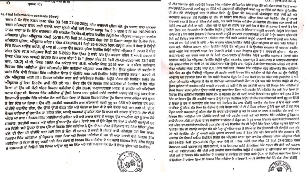 ਮਜੀਠੀਆ ਵਿਰੁੱਧ ਦਰਜ ਨਵੀਂ ਐਫਆਈਆਰ ਦੀ ਕਾਪੀ ਆਈ ਸਾਹਮਣੇ, ਸਰਕਾਰੀ ਕੰਮ ਵਿੱਚ ਰੁਕਾਵਟ ਪਾਉਣ ਦਾ ਦੋਸ਼